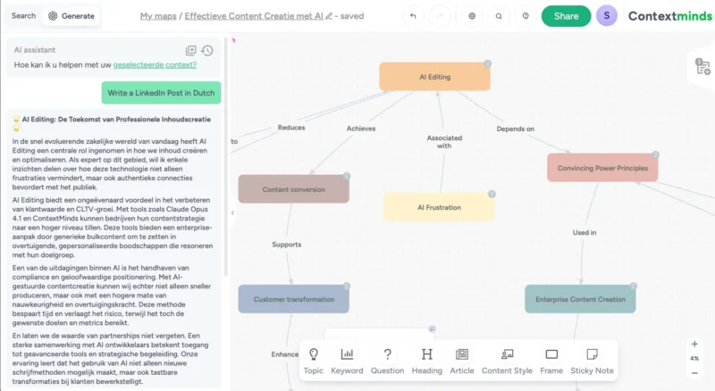 The AI output is continuously so bad that I have to throw it away every time; it doesn’t reach the level of ‘manual writing’. The app thinks in paragraphs but doesn’t really know how to create a convincing structure for the article, and keeps ‘forgetting’ the goal of the article. Combining paragraphs from different articles with ContextMinds also happens too randomly, causing me to lose another half hour. Even more generic ‘garbage’ that I don’t even want to read myself. A no-go.